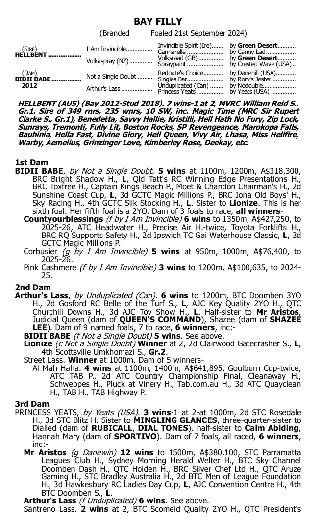 Her sire, Hellbent, is a rising star in Australasian breeding, increasingly proving himself with daughters of exceptional class, including Group 1 winners Magic Time and Benedetta. She is already a three-quarter sister to the stakes-placed Countyourblessings and is out of the stakes-winning mare Bidii Babe.