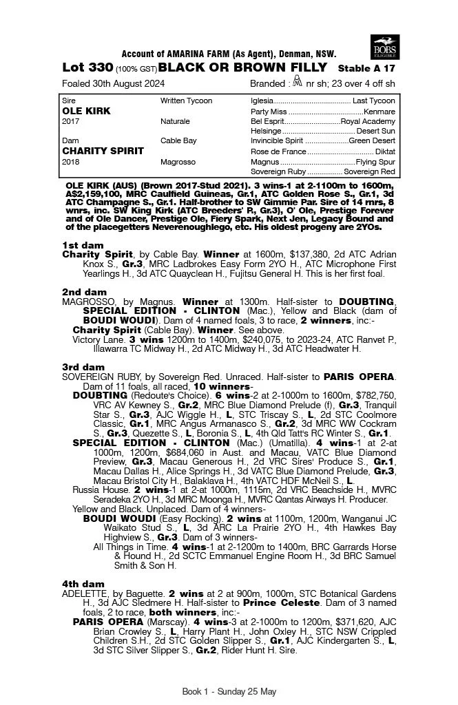 Pedigree-wise, she’s out of the Group 3-placed mare Charity Spirit, and her pedigree is further enhanced by her close relation to early types like Doubting (G3 Blue Diamond Prelude winner) and Special Edition (G1 Sires' Produce runner-up).