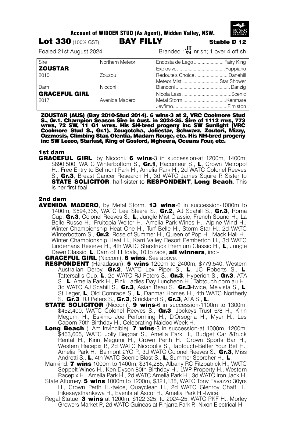 Lot 330 - Zoustar needs no introduction as Australia’s leading sire with 7.4% stakes winners to runners, including top-class Group 1 winning fillies such as Zougotcha, Sunlight, Joliestar & Mizzy as well as our very own Group 1 winning stallion, Ozzmosis.